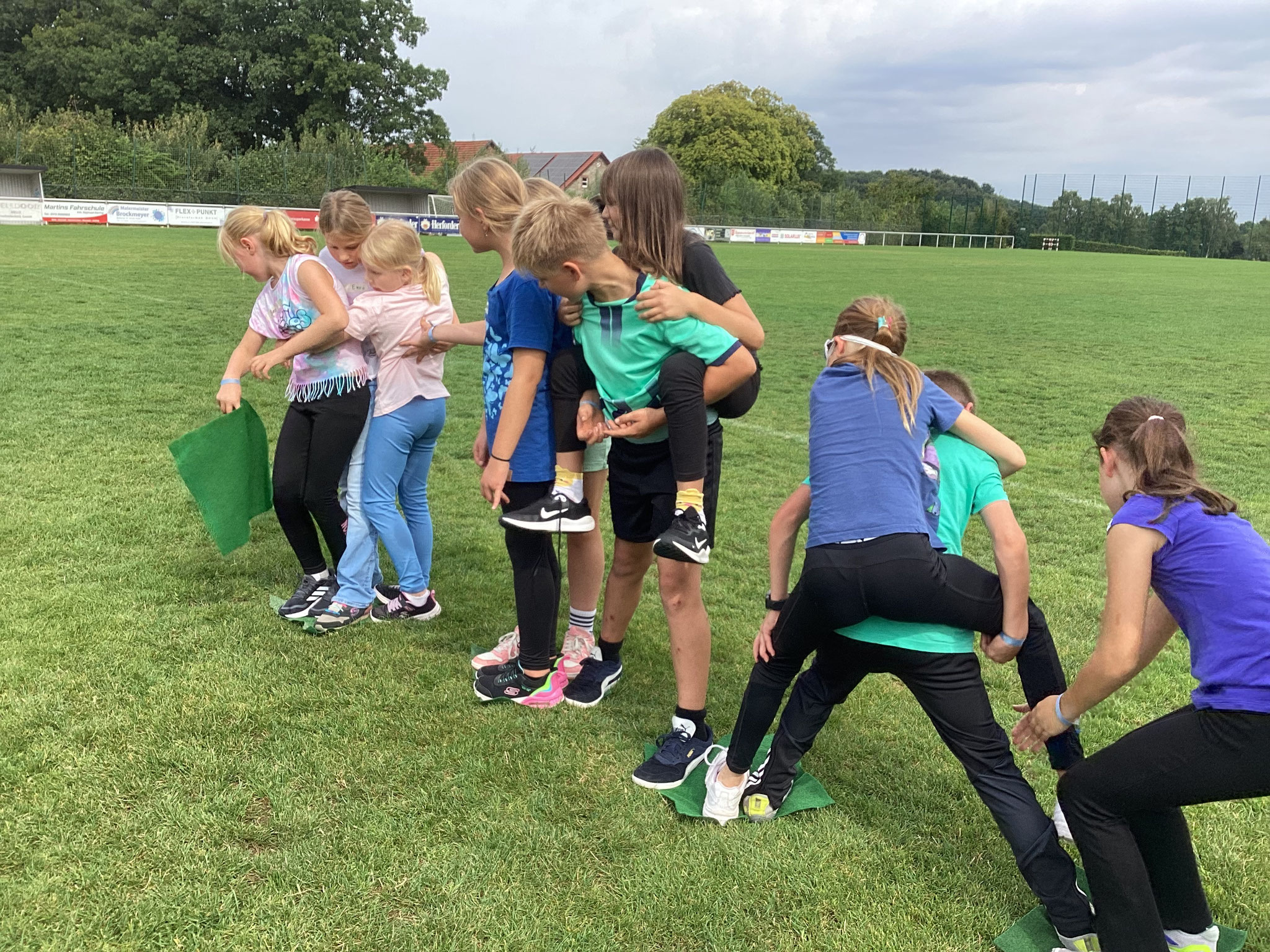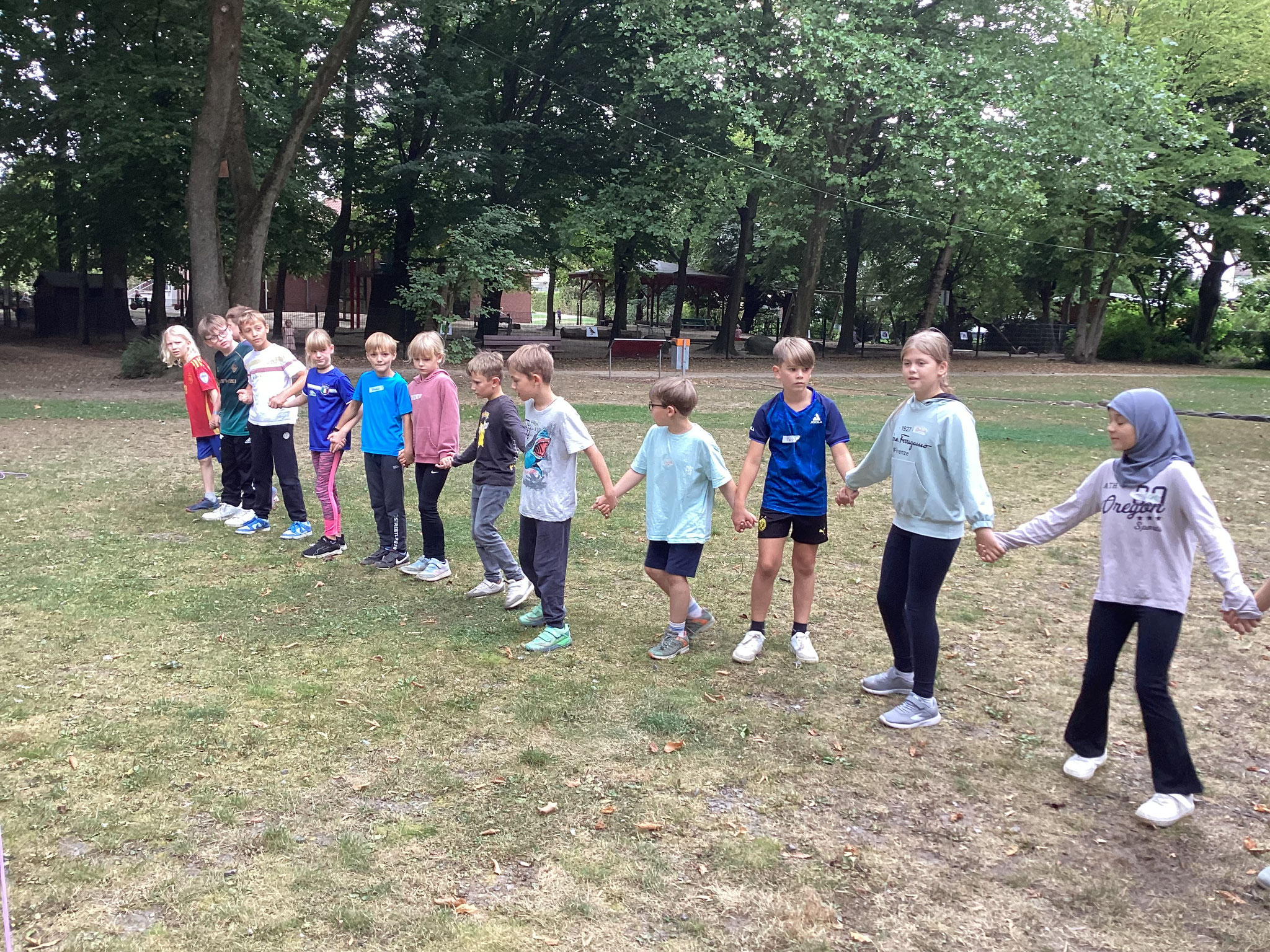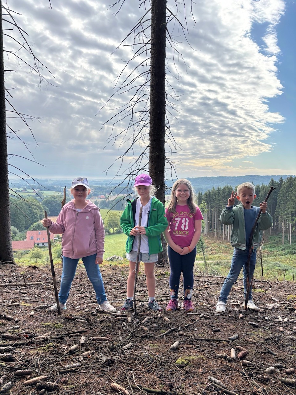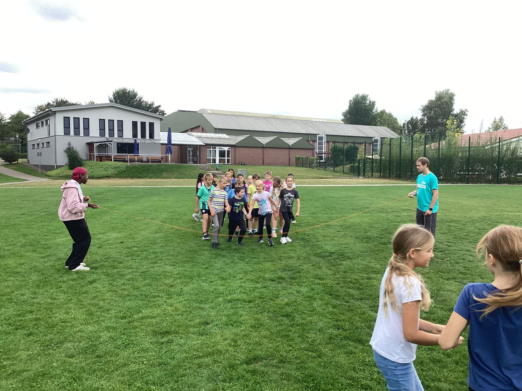 An drei aufeinanderfolgenden Tagen durften die Viertklässler viel erleben! Zunächst ging es in die Kletterhalle, in der die Kinder sich mutig ausprobierten und alleine und in der Gruppe über sich hinauswuchsen. Der zweite Tag begann mit einem gemeinsamen Frühstück im Jahrgang. Danach bekam jede Klasse Unterstützung von einem professionellen Teamer, der die Gruppe anleitete mit Sport, Spiel und Spaß, aber natürlich auch mit kniffeligen Gruppenaufgaben, bei denen Teamgeist, Geduld und Frustrationstoleranz gefragt waren. Das ein oder andere Spiel wird bestimmt im Unterrichtsalltag einen Platz finden. Jeden Tag hatten wir Glück mit dem Wetter, so konnten wir auch am dritten Tag trockenen Fußes zur Alma-Quelle wandern. Gut gelaunt wurde dort erstmal gefrühstückt und danach verteilten sich die Kinder im Wald zum Buden bauen, klettern, Sonnenuhr bauen, Wasser und Tiere untersuchen mit der Becherlupe. Damit verging die Zeit wie im Fluge und bei Sonnenschein sind wir zurück ins Dorf gelaufen. All die schönen Erinnerungen und Erfahrungen nehmen wir mit in unseren Unterrichtsalltag.