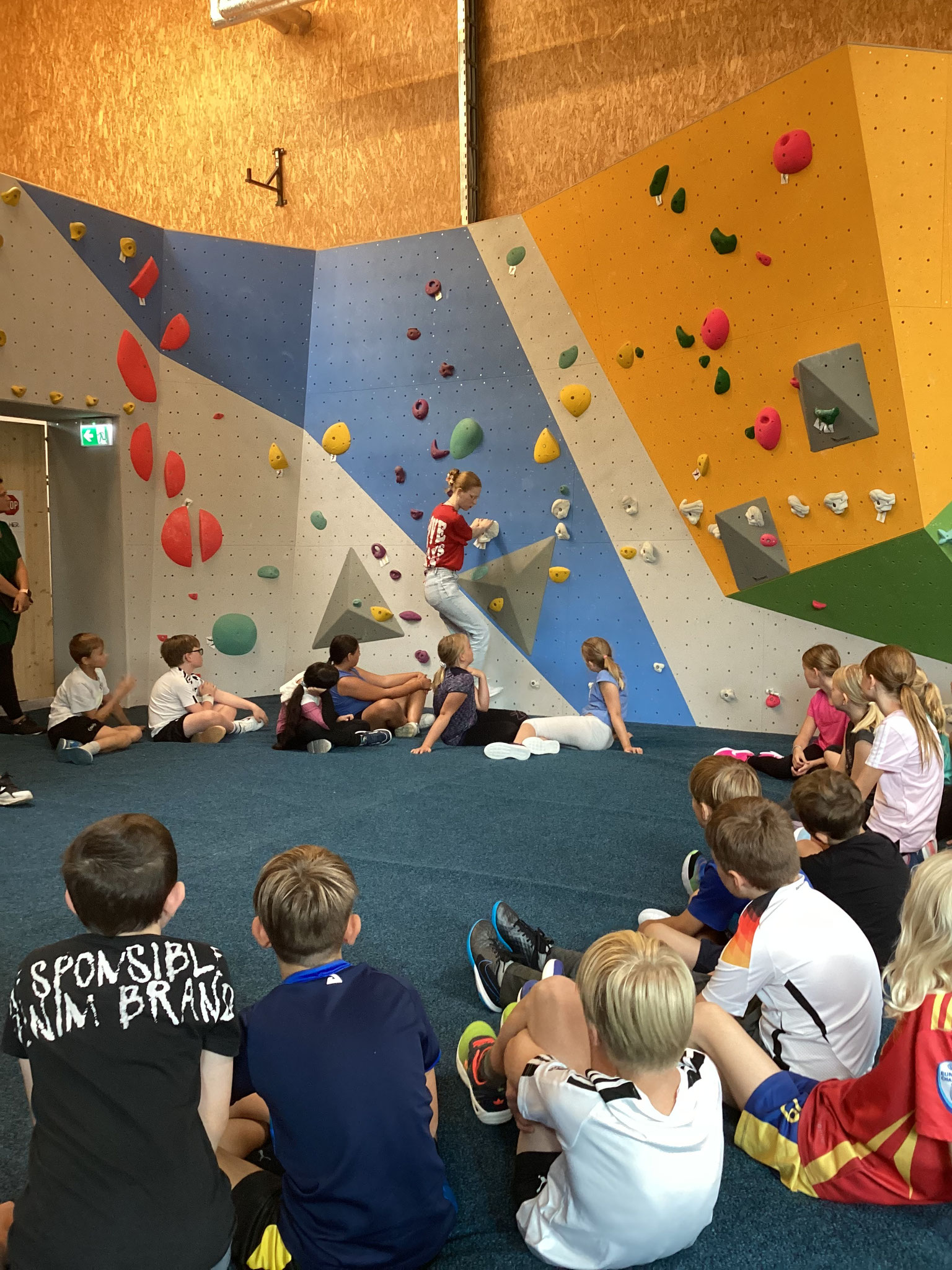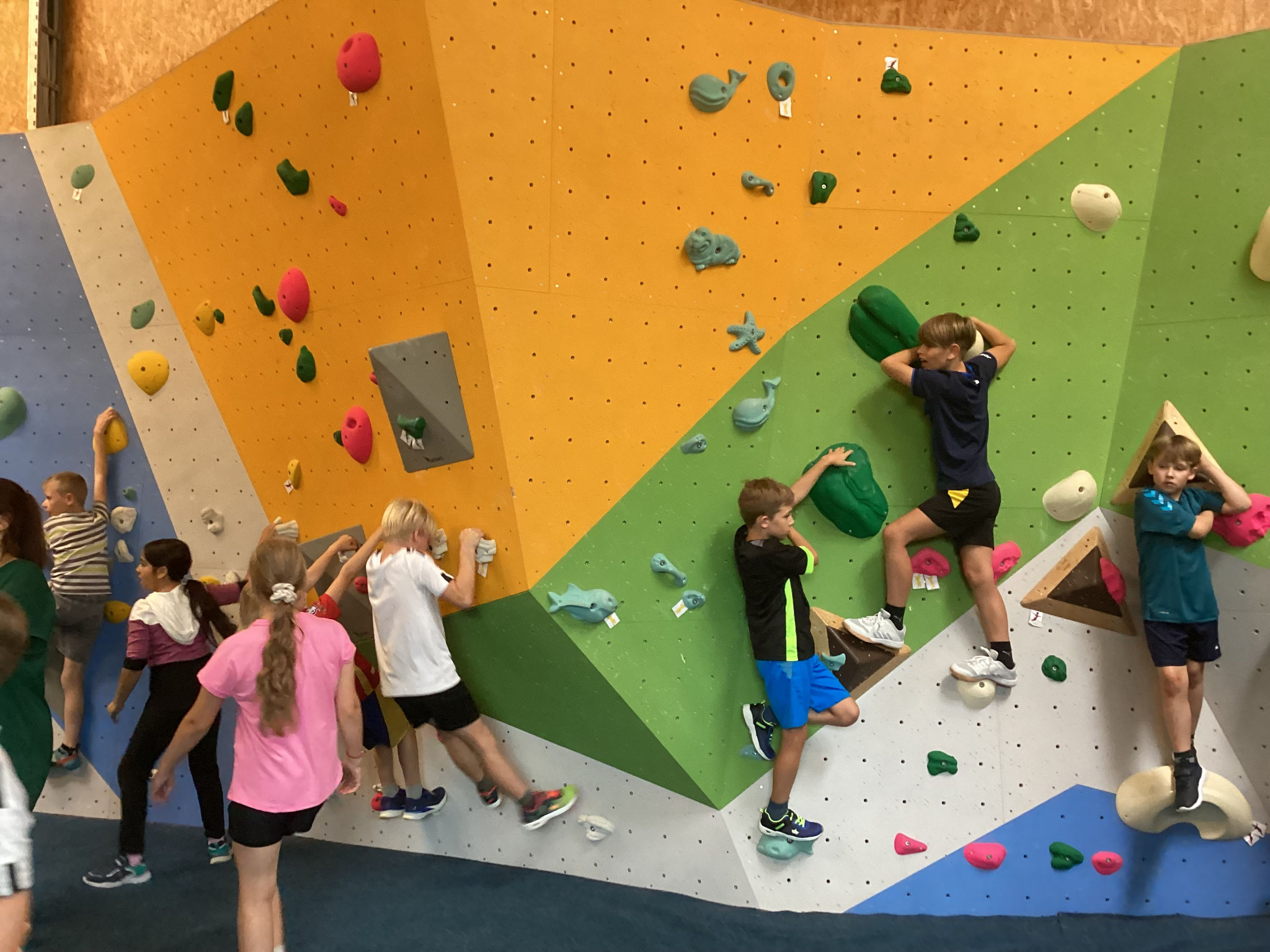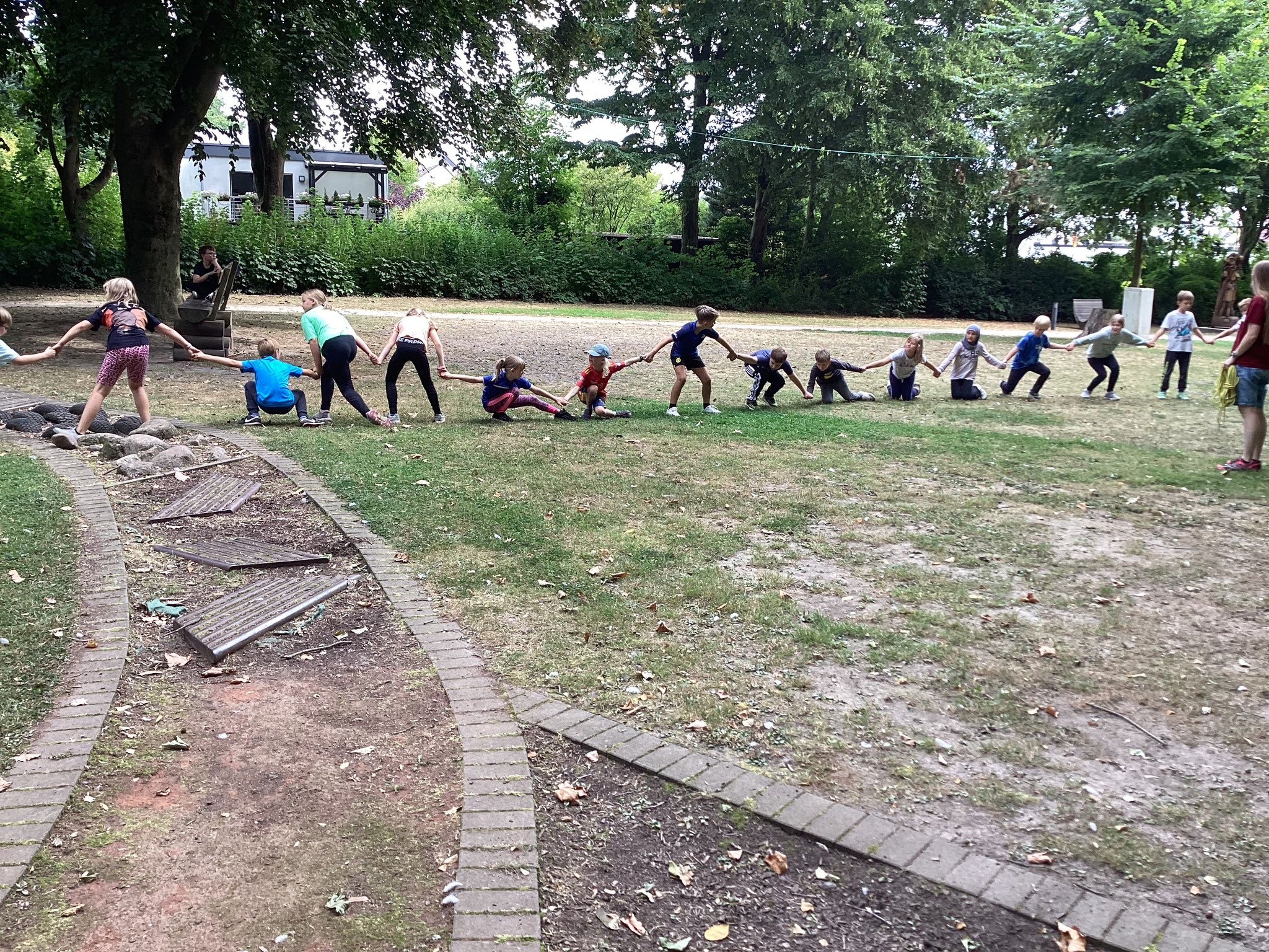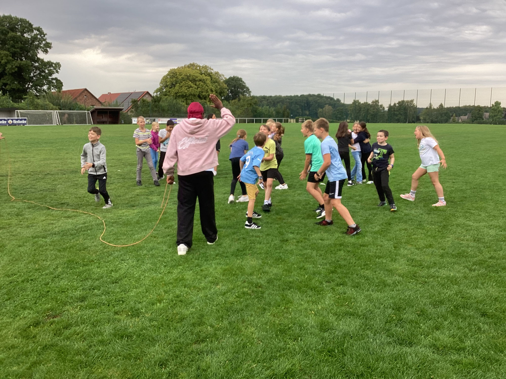 An drei aufeinanderfolgenden Tagen durften die Viertklässler viel erleben! Zunächst ging es in die Kletterhalle, in der die Kinder sich mutig ausprobierten und alleine und in der Gruppe über sich hinauswuchsen. Der zweite Tag begann mit einem gemeinsamen Frühstück im Jahrgang. Danach bekam jede Klasse Unterstützung von einem professionellen Teamer, der die Gruppe anleitete mit Sport, Spiel und Spaß, aber natürlich auch mit kniffeligen Gruppenaufgaben, bei denen Teamgeist, Geduld und Frustrationstoleranz gefragt waren. Das ein oder andere Spiel wird bestimmt im Unterrichtsalltag einen Platz finden. Jeden Tag hatten wir Glück mit dem Wetter, so konnten wir auch am dritten Tag trockenen Fußes zur Alma-Quelle wandern. Gut gelaunt wurde dort erstmal gefrühstückt und danach verteilten sich die Kinder im Wald zum Buden bauen, klettern, Sonnenuhr bauen, Wasser und Tiere untersuchen mit der Becherlupe. Damit verging die Zeit wie im Fluge und bei Sonnenschein sind wir zurück ins Dorf gelaufen. All die schönen Erinnerungen und Erfahrungen nehmen wir mit in unseren Unterrichtsalltag.
