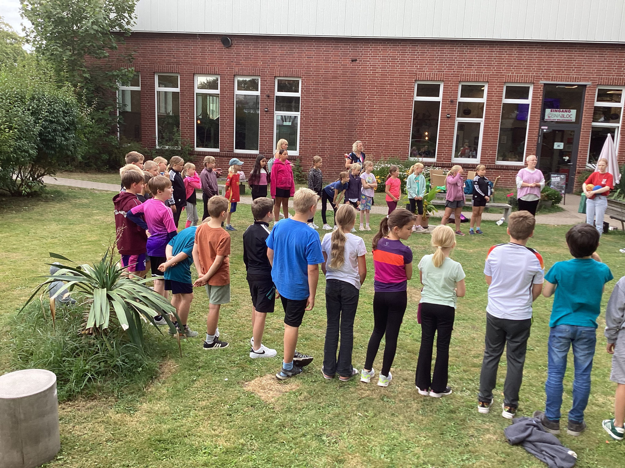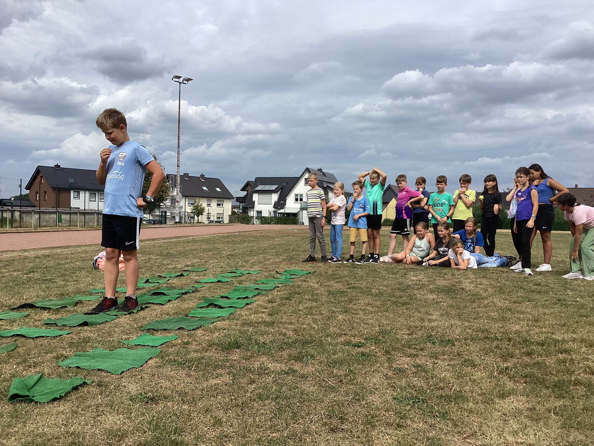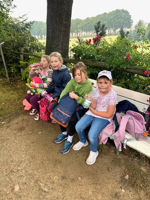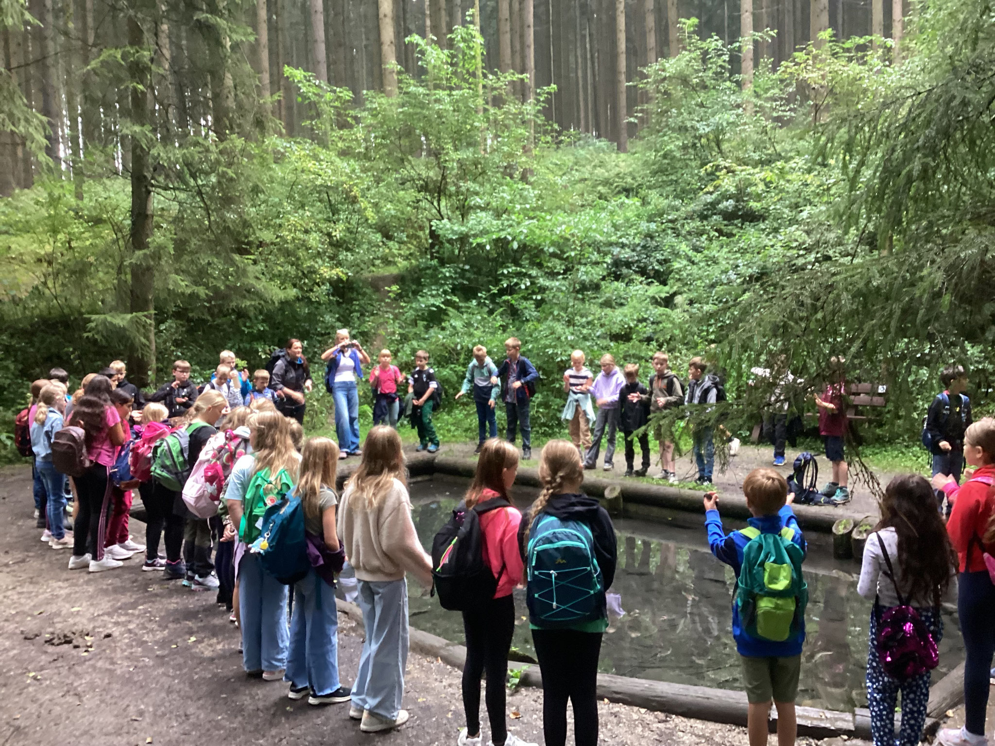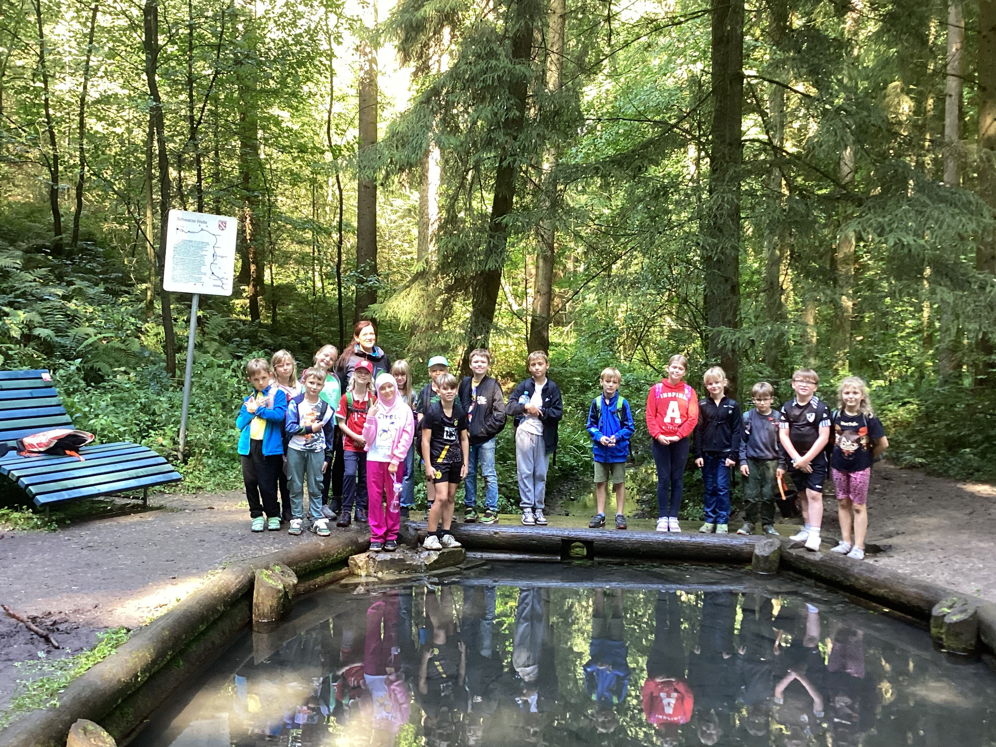 An drei aufeinanderfolgenden Tagen durften die Viertklässler viel erleben! Zunächst ging es in die Kletterhalle, in der die Kinder sich mutig ausprobierten und alleine und in der Gruppe über sich hinauswuchsen. Der zweite Tag begann mit einem gemeinsamen Frühstück im Jahrgang. Danach bekam jede Klasse Unterstützung von einem professionellen Teamer, der die Gruppe anleitete mit Sport, Spiel und Spaß, aber natürlich auch mit kniffeligen Gruppenaufgaben, bei denen Teamgeist, Geduld und Frustrationstoleranz gefragt waren. Das ein oder andere Spiel wird bestimmt im Unterrichtsalltag einen Platz finden. Jeden Tag hatten wir Glück mit dem Wetter, so konnten wir auch am dritten Tag trockenen Fußes zur Alma-Quelle wandern. Gut gelaunt wurde dort erstmal gefrühstückt und danach verteilten sich die Kinder im Wald zum Buden bauen, klettern, Sonnenuhr bauen, Wasser und Tiere untersuchen mit der Becherlupe. Damit verging die Zeit wie im Fluge und bei Sonnenschein sind wir zurück ins Dorf gelaufen. All die schönen Erinnerungen und Erfahrungen nehmen wir mit in unseren Unterrichtsalltag.