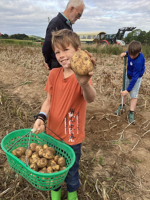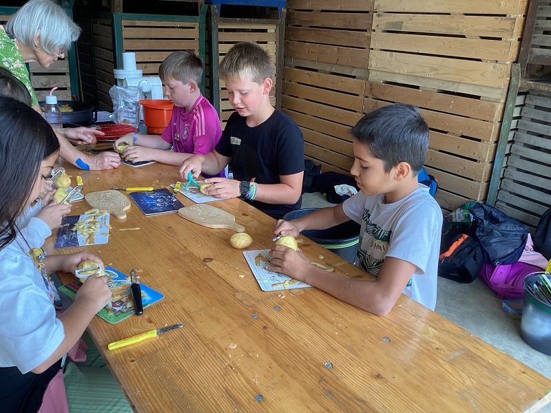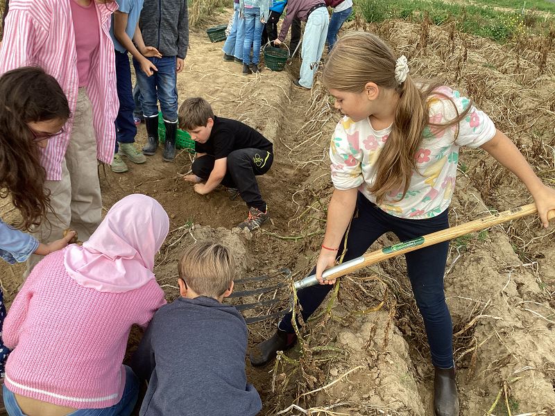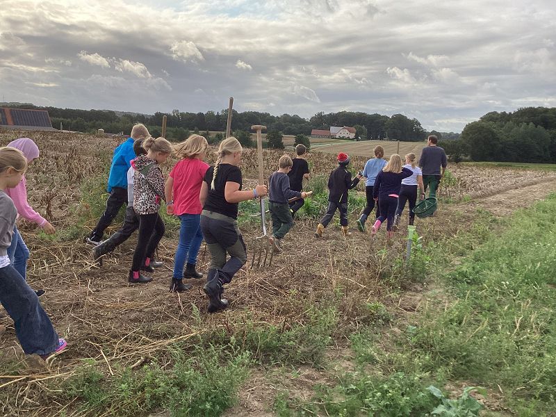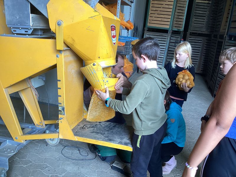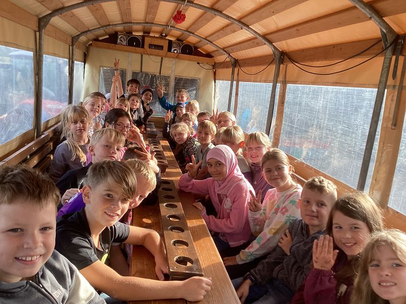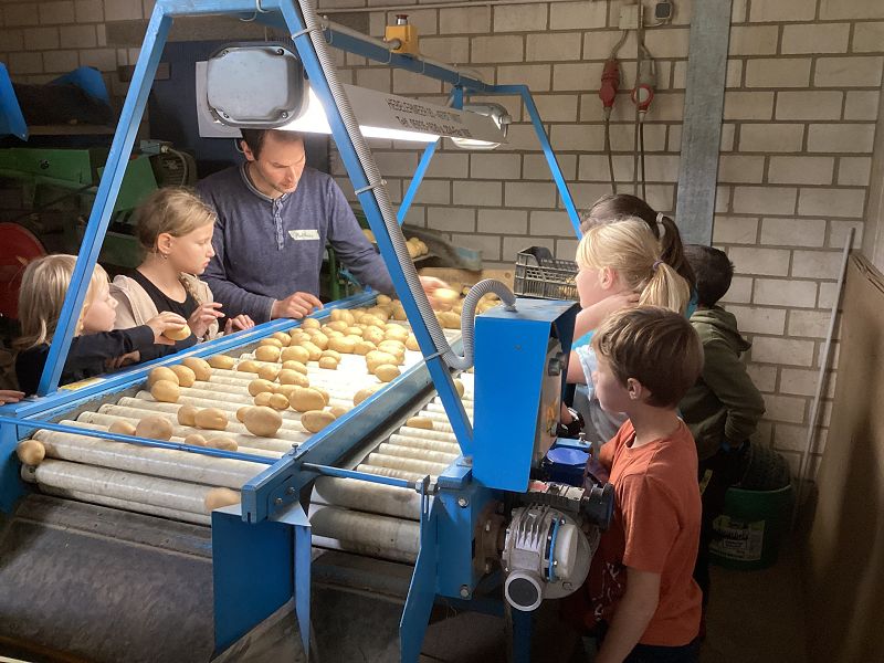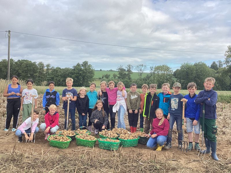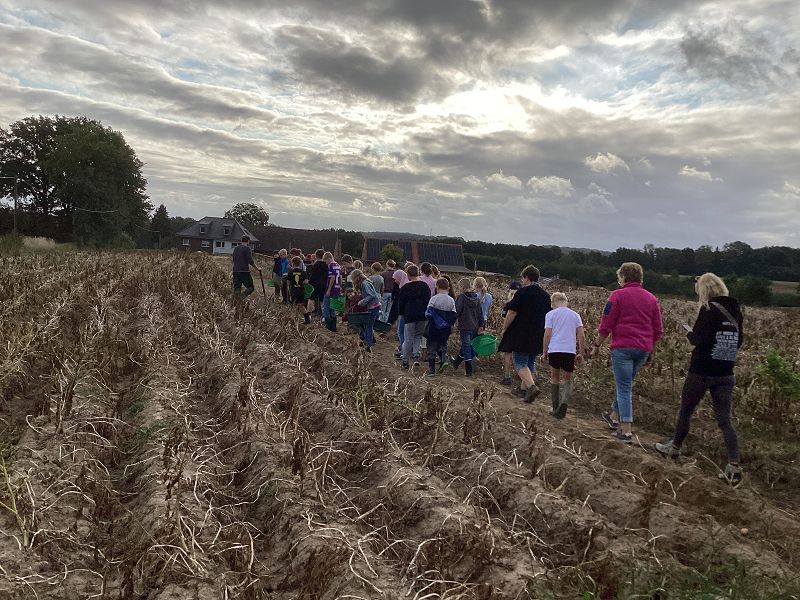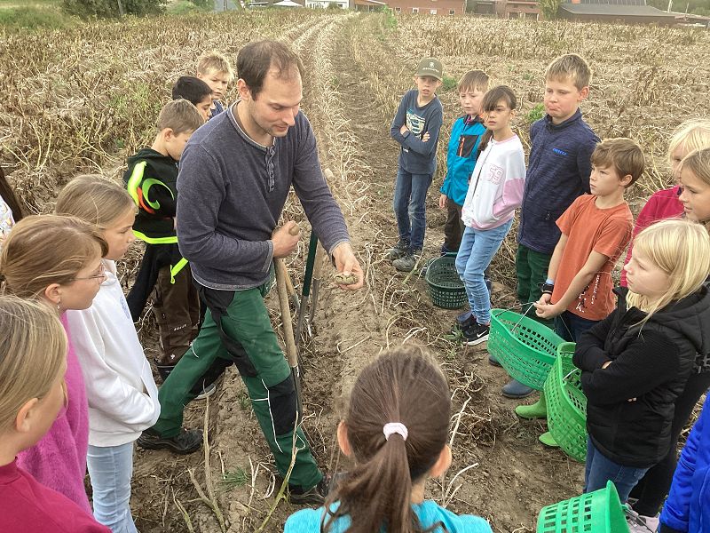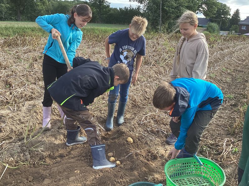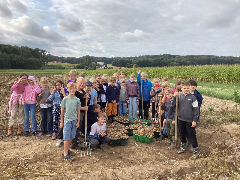 Am 3. und 4. September waren wir Kinder der vierten Klassen auf dem Kartoffelhof Wulbusch. Mit dem Planwagen ging es auf das Feld zum Ernten. Danach durften wir an Stationen viel über die Kartoffel erfahren: zu was sie verarbeitet wird, wie sie sortiert, gewogen und in Säcke gefüllt wird. Wir haben unsere selbst geernteten Kartoffeln geschält und daraus leckere Kartoffelpuffer gebacken. Das war ein unvergesslicher Tag. Vielen Dank an das Team von "Transparenz schaffen" des Meller Landvolkes, Familie Wulbusch und den Förderverein, der die Buskosten übernommen hat.