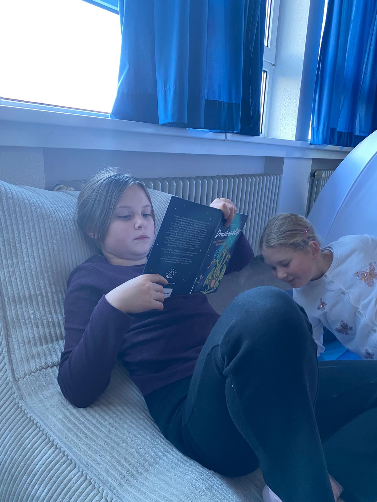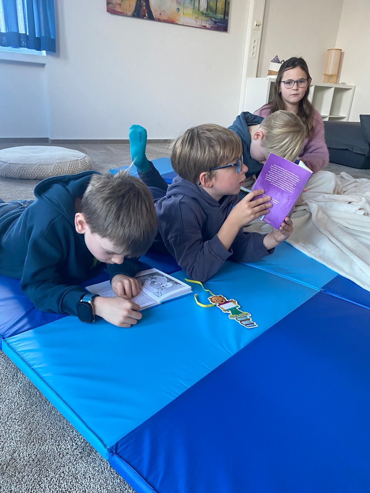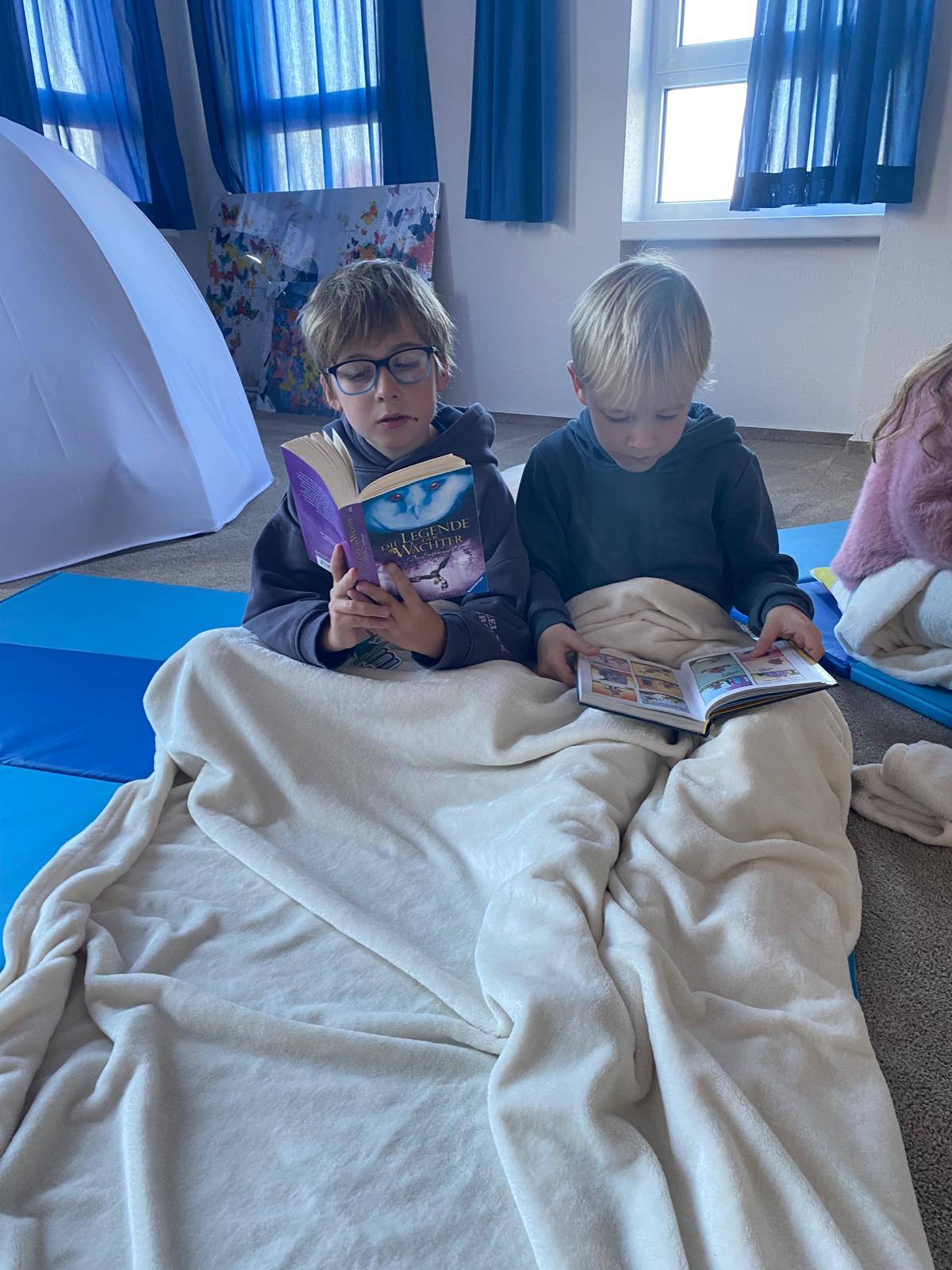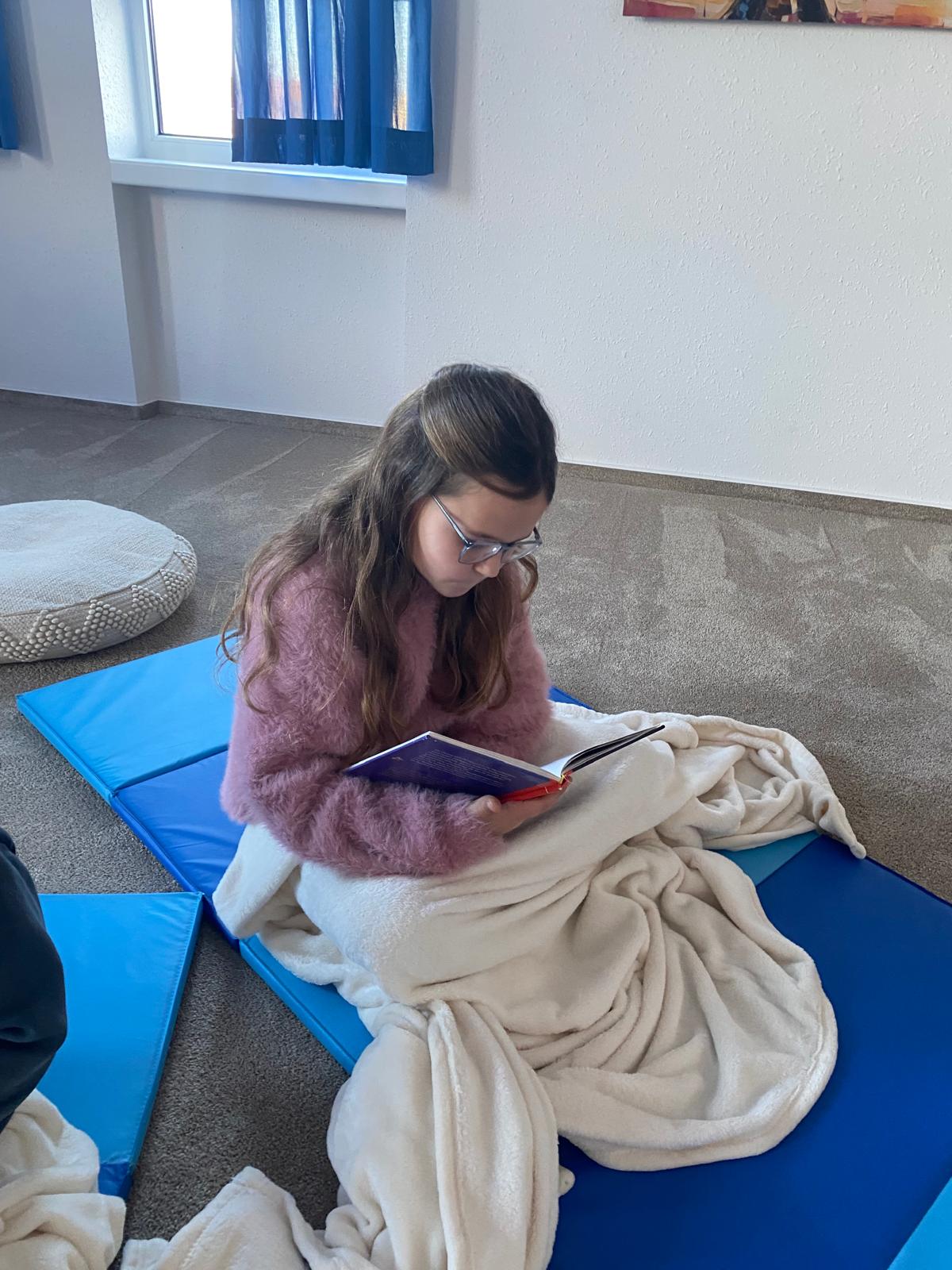 Im Lesecafe dürfen sich die Kinder mit ihrem mitgebrachten Buch einen gemütlichen Leseplatz im Ruheraum suchen und dort dann lesen. Zwischendurch wird von den selbstgebackenen Plätzchen genascht. Wir sind uns einig: Lesen kann so schön sein!