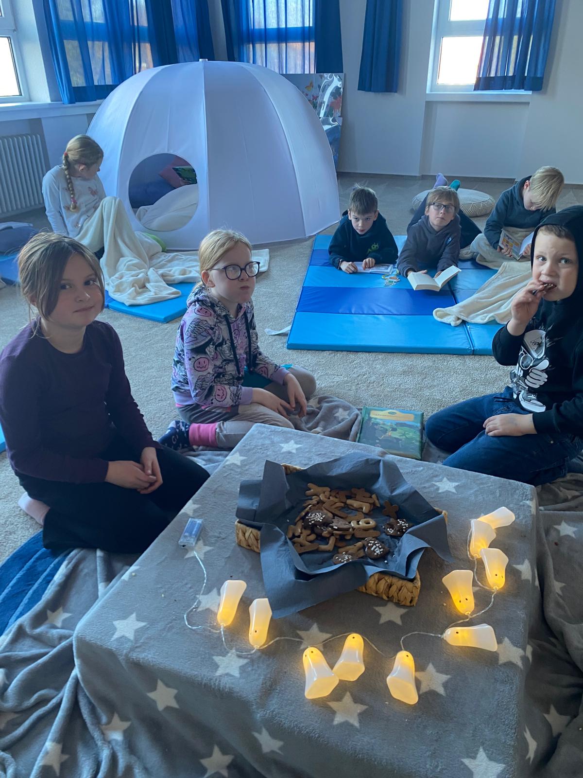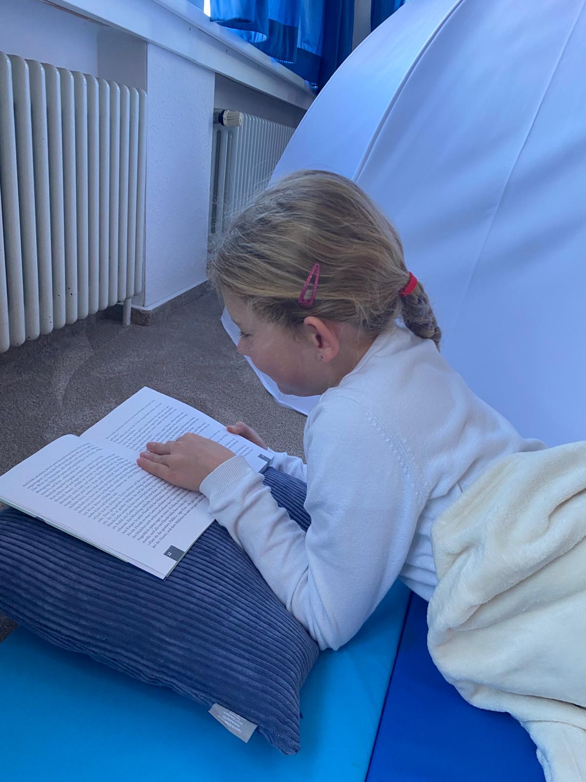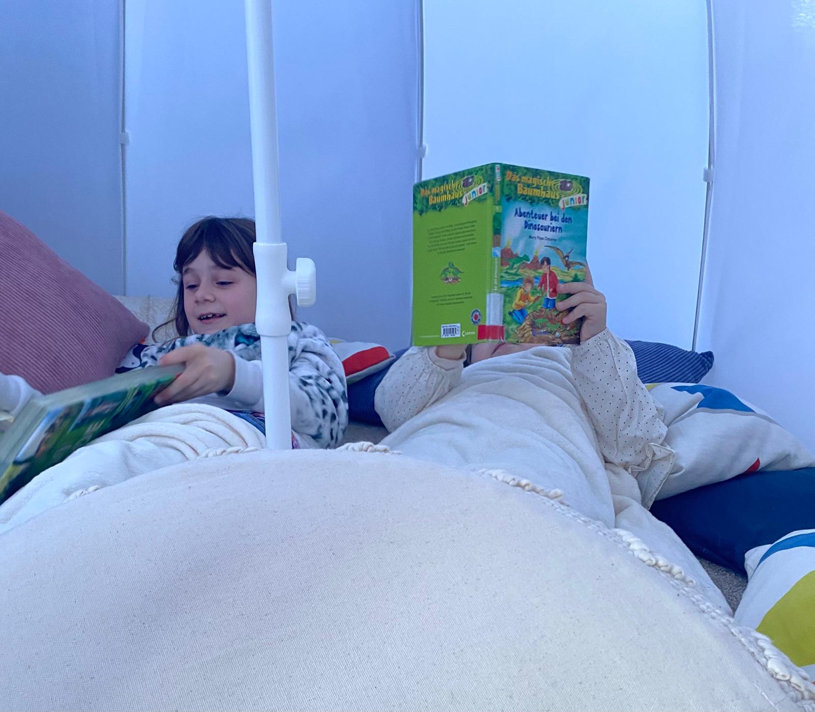 Im Lesecafe dürfen sich die Kinder mit ihrem mitgebrachten Buch einen gemütlichen Leseplatz im Ruheraum suchen und dort dann lesen. Zwischendurch wird von den selbstgebackenen Plätzchen genascht. Wir sind uns einig: Lesen kann so schön sein!