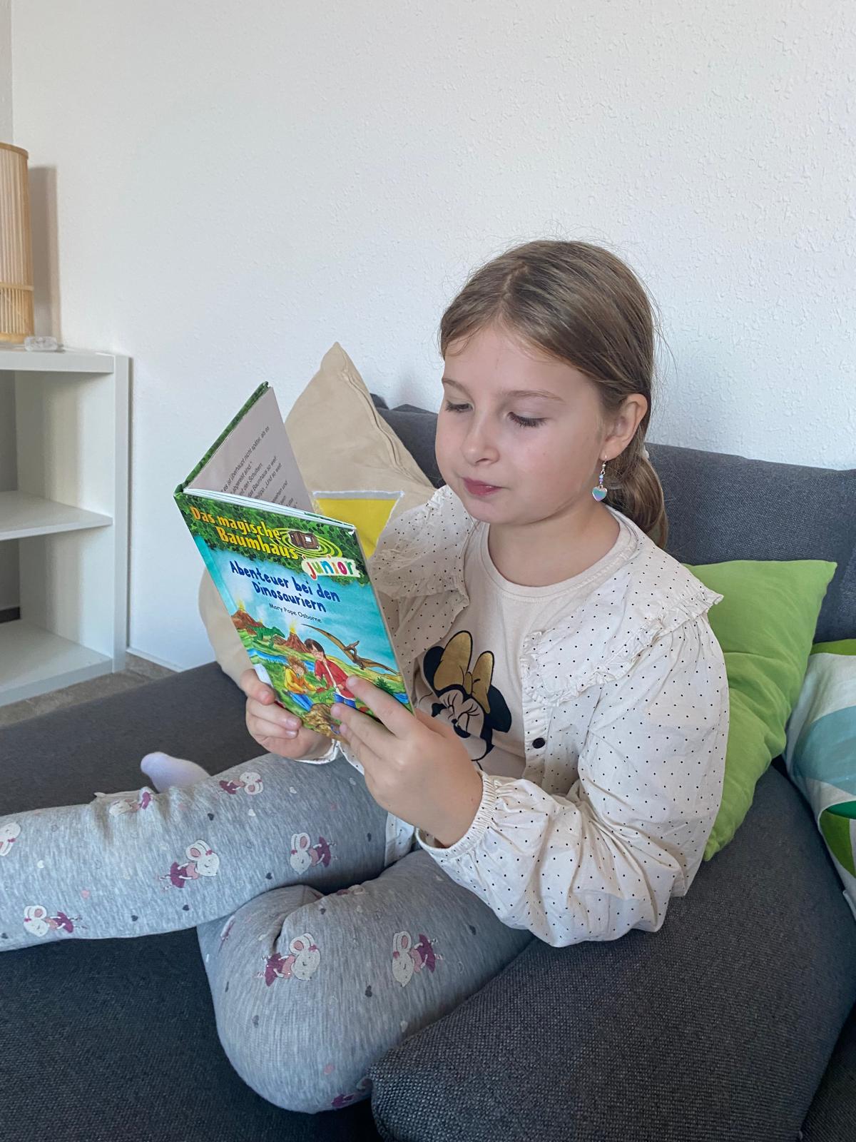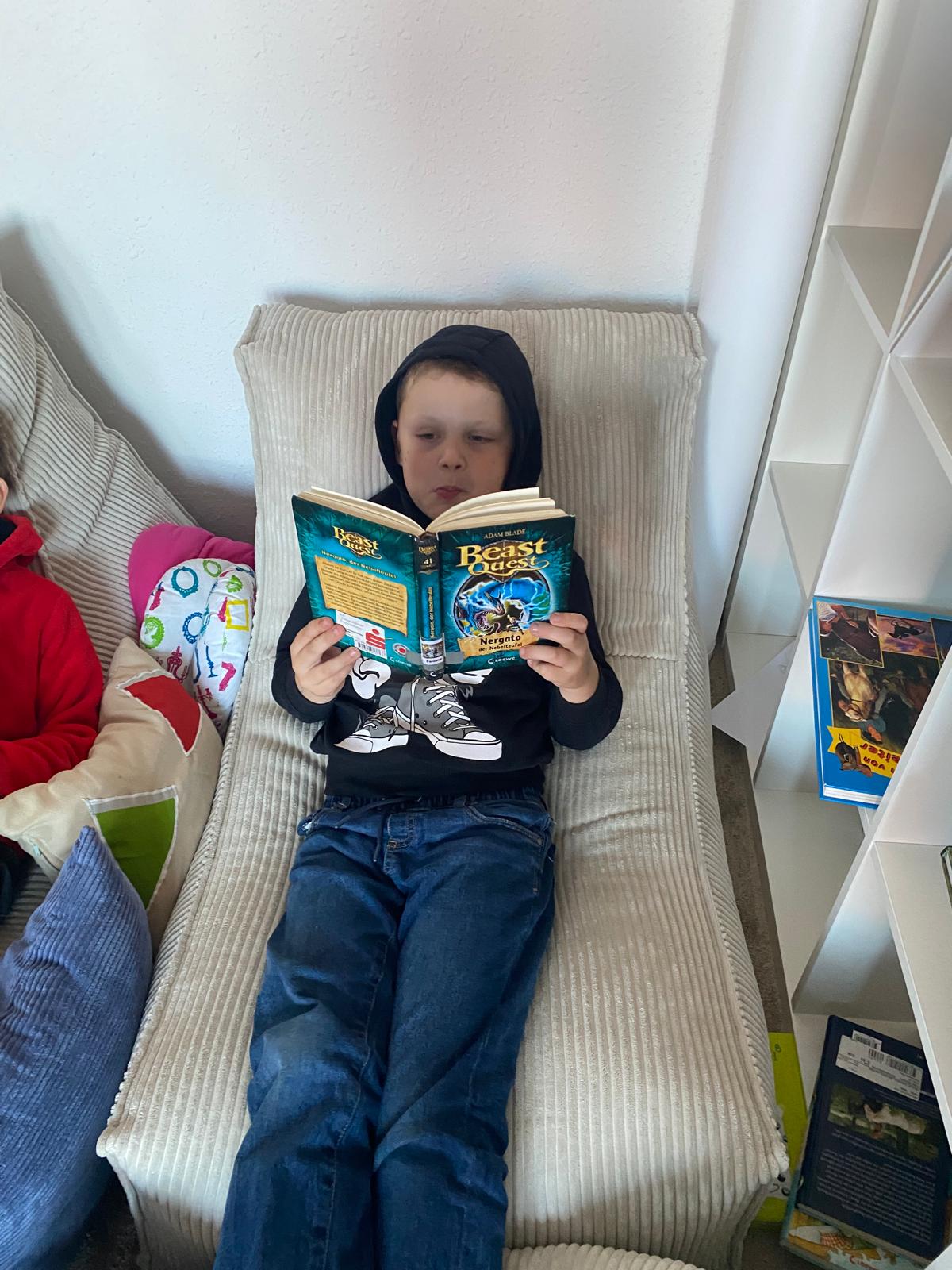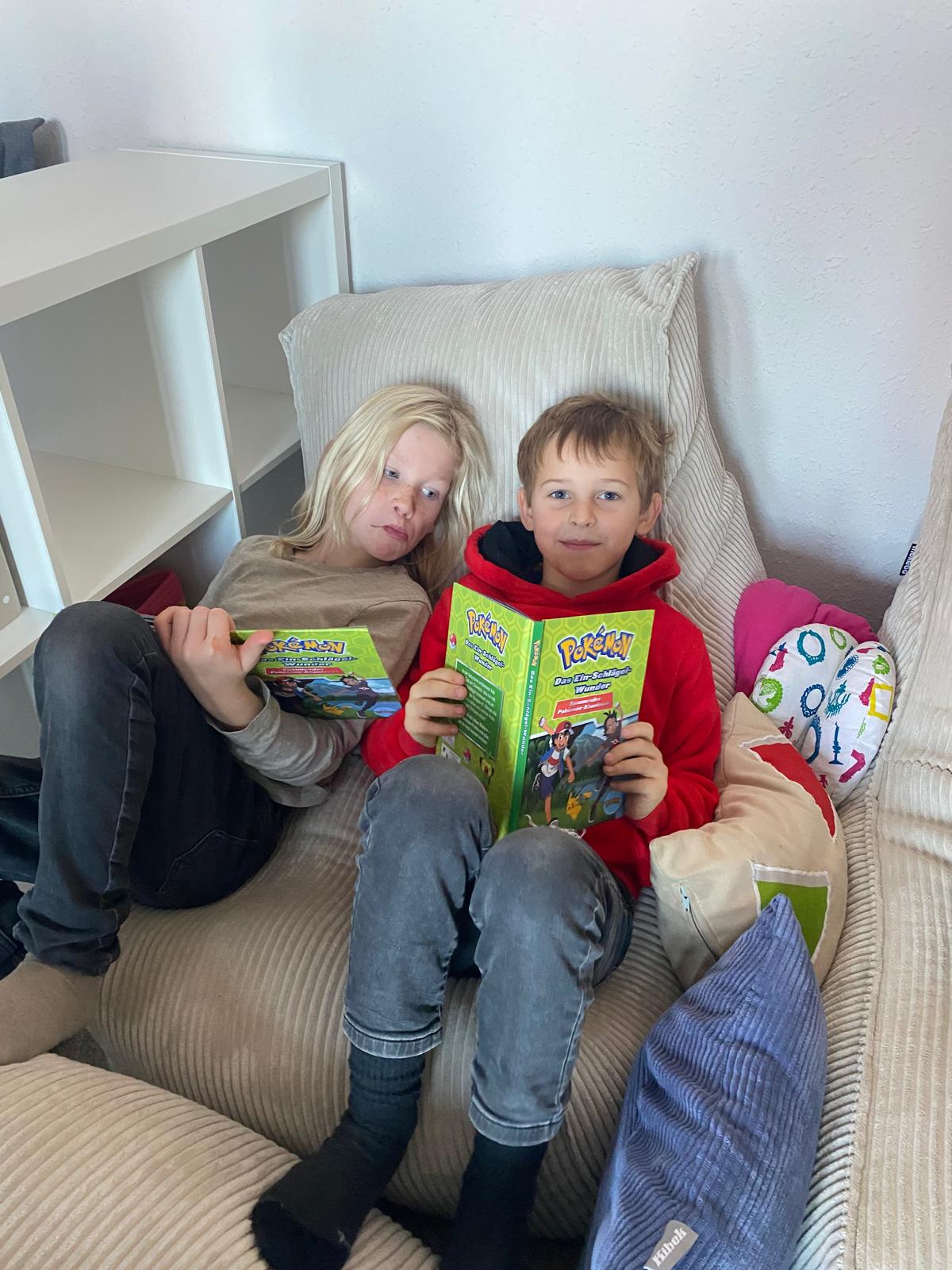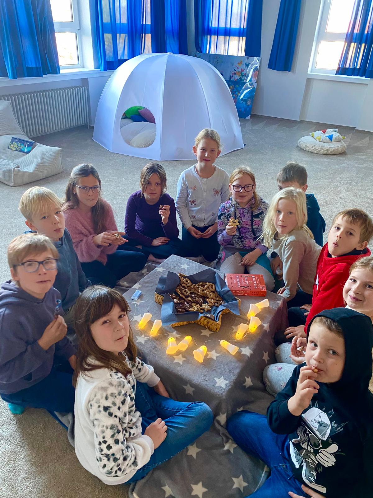 Im Lesecafe dürfen sich die Kinder mit ihrem mitgebrachten Buch einen gemütlichen Leseplatz im Ruheraum suchen und dort dann lesen. Zwischendurch wird von den selbstgebackenen Plätzchen genascht. Wir sind uns einig: Lesen kann so schön sein!